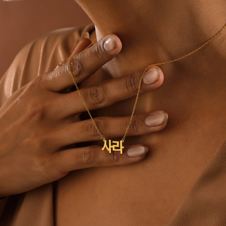 Celebrate your identity or surprise a loved one with the 14K Gold Korean Name Necklace. This exquisite piece captures the elegance of Hangul script, offering a unique way to wear your name or a special word close to your heart. Each necklace is carefully handcrafted to ensure it is as unique as the individual who wears it. Any name, even if it's in English, will be translated into Korean for a truly personalized touch.